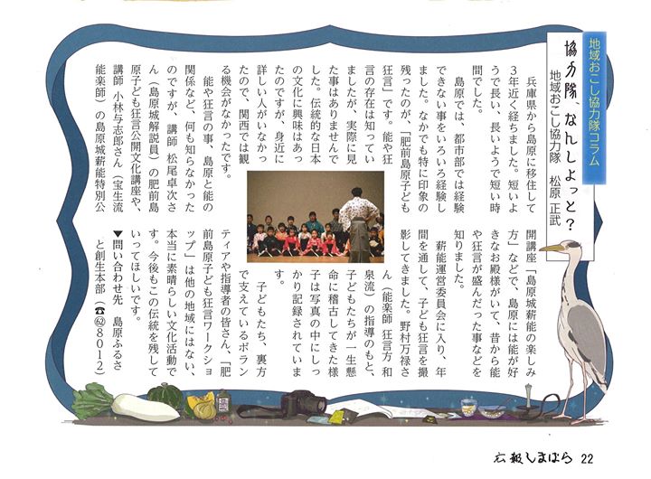 広報しまばら12月号の22ページ「地域おこし協力隊コラム」に、島原市地域おこし協力隊で島原城薪能振興会の運営委員として撮影を担当してくださ...