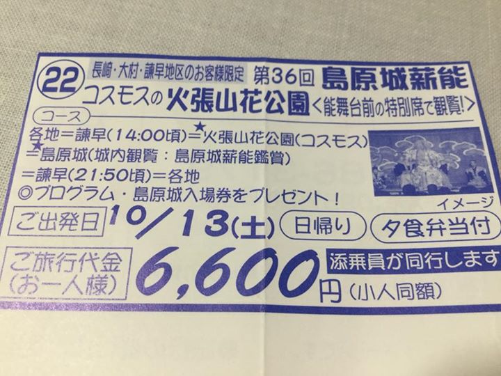 毎年、大好評の島原城薪能の鑑賞と秋の島原観光をあわせた日帰りバスツアー! いよいよ募集がはじまっています。 長崎各地、諫早方面からご来場い...