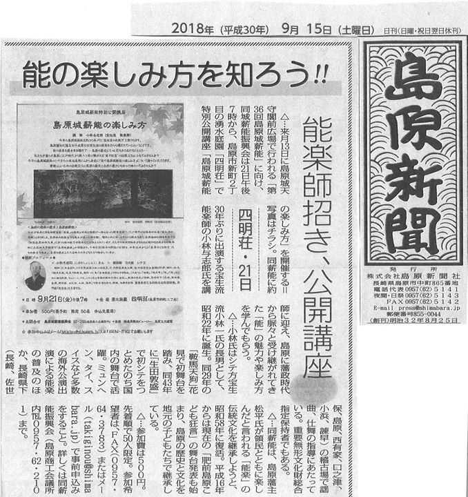 島原の伝統ある地域新聞「島原新聞」の9月15日(土)付に9月21日(金)の特別公開講座のことが紹介されました!島原新聞社様ありがとうござ...
