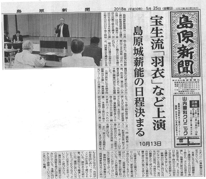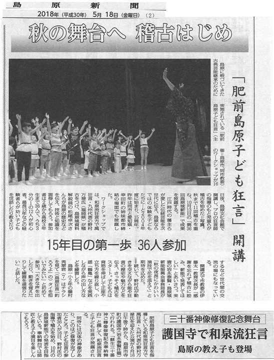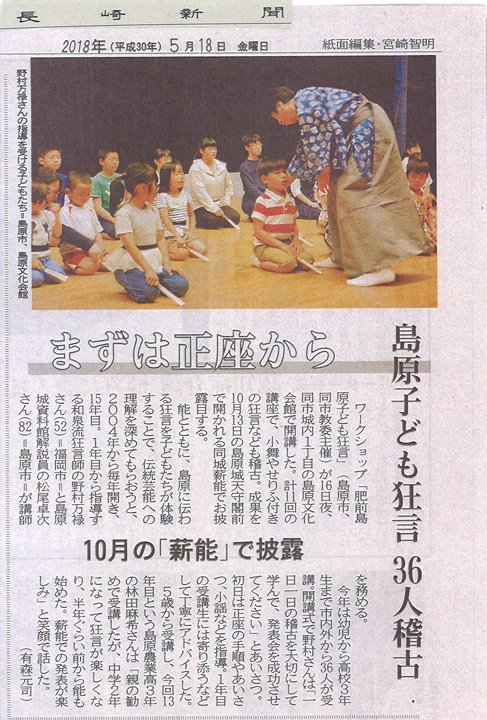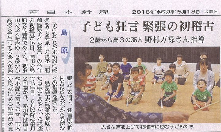 「長崎新聞」(5月18日付)にも16日の「肥前島原子ども狂言」の開講式と野村万禄先生の指導によるお稽古の様子が紹介されました。長崎新聞社様...