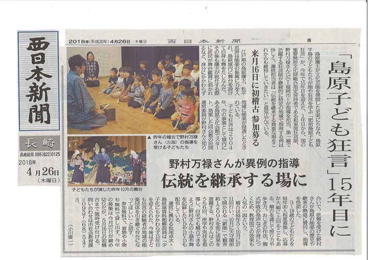 今年で15周年をむかえる「肥前島原子ども狂言」の取り組みと、今年度の参加者募集!について、西日本新聞(2018年4月26日付)で取材し掲...