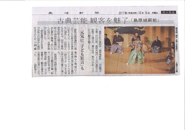 10月14日(土)に開催した「第35回島原城薪能」について、長崎新聞社さま(2017年10月16日付)が取材してくださいました。ありがとう...