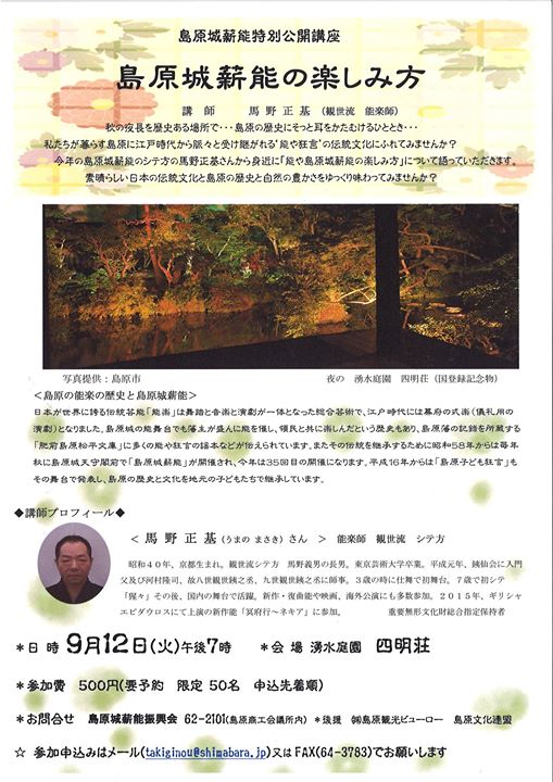 島原城薪能特別公開講座「島原城薪能の楽しみ方」を開催します! 会場は秋の夜長の‘湧水庭園 四明荘(国登録記念物)です。 講師は今年の島原城...