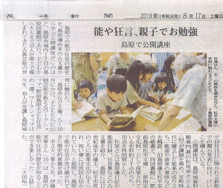 長崎新聞(2019年8月17日付) さまに、先日の肥前島原子ども狂言公開文化講座「島原城薪能松平文庫」が紹介されました。 長崎新聞様ありが...