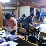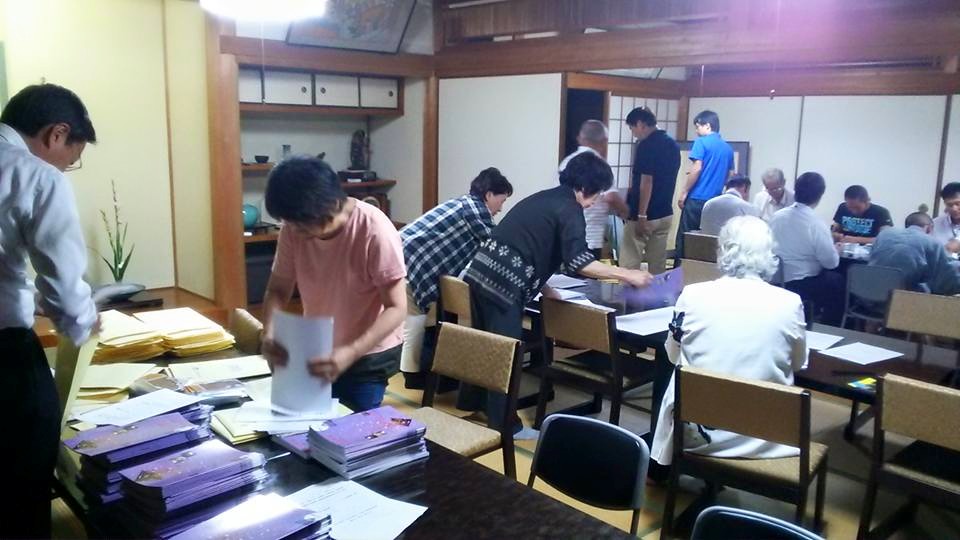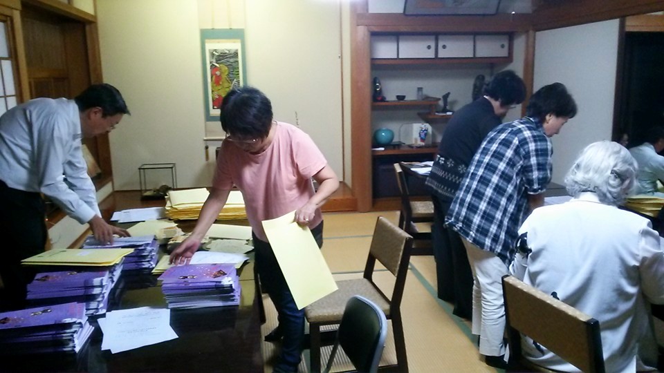15日夜には島原城薪能振興会の運営委員会で、賛助会員や広告協賛企業の皆様へ、発送作業を行いました。 作業終了後は、本番を1か月後を控えての綿密な打ち合わせの会議。会議の終了はなんと約午後11時半!