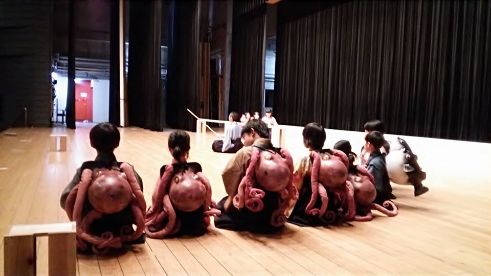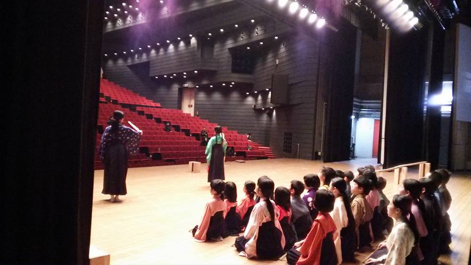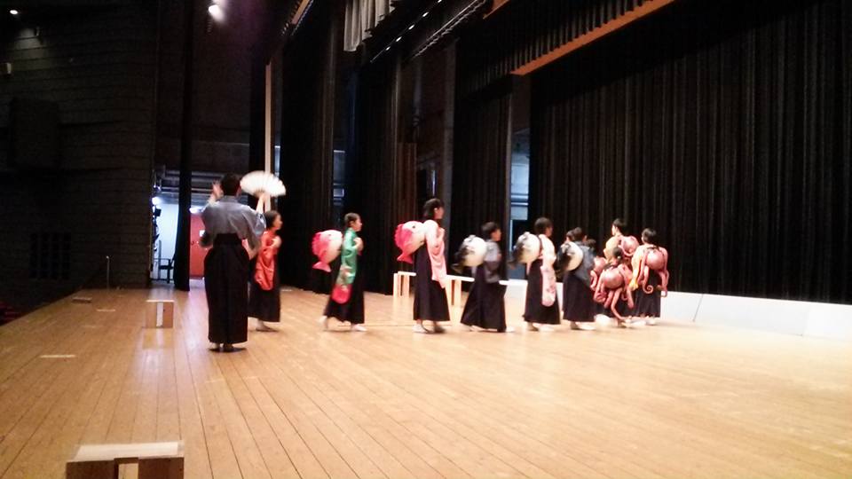 講師の日本を代表する和泉流狂言方の野村万禄さんと一緒に、おさらい会も舞台にたたせていただく子ども達。