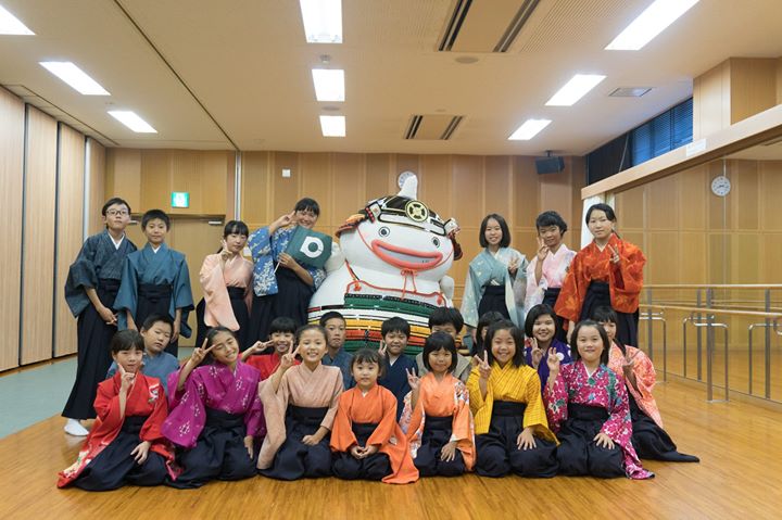 島原市・有明町姉妹都市締結調印式でお祝いの狂言をご披露した子どもたち。舞台で共演した、島原市のキャラクター‘しまばらさん’を見ると大喜び♬ せっかくなので、記念写真を撮っていただきました。