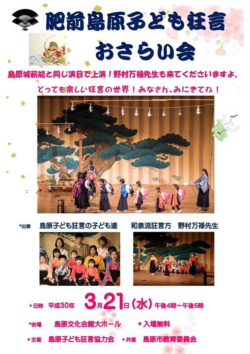 Mar 20, 2018 さあ。 さあ。いよいよ明日は子ども狂言島原おさらい会です。 島原城薪能で発表した演目を再演!みなさまぜひお出かけください。 和泉流狂言方の野村万禄先生も来島されます。 Facebook Tweet Posted in お知らせ | No Comments » 関連記事 第43回島原城薪能(会場変更) 九州子ども狂言交流舞台in島原(会場変更) 島原城薪能を味わう 四明荘特別公開講座 いよいよ明日!島原城天守閣前特設能舞台で開催! 島原能楽サロン「島原城薪能を味わう~金剛流能「内外詣」のお話~」 < さあ。 今年の「肥前島原子ども狂言おさらい会」も、立派に子どもたちが舞台をつとめてくれました。 >