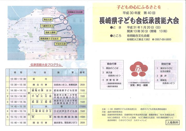 今週末は長崎県子ども会伝承芸能大会が島原市の有明総合文化会館で開催されます。