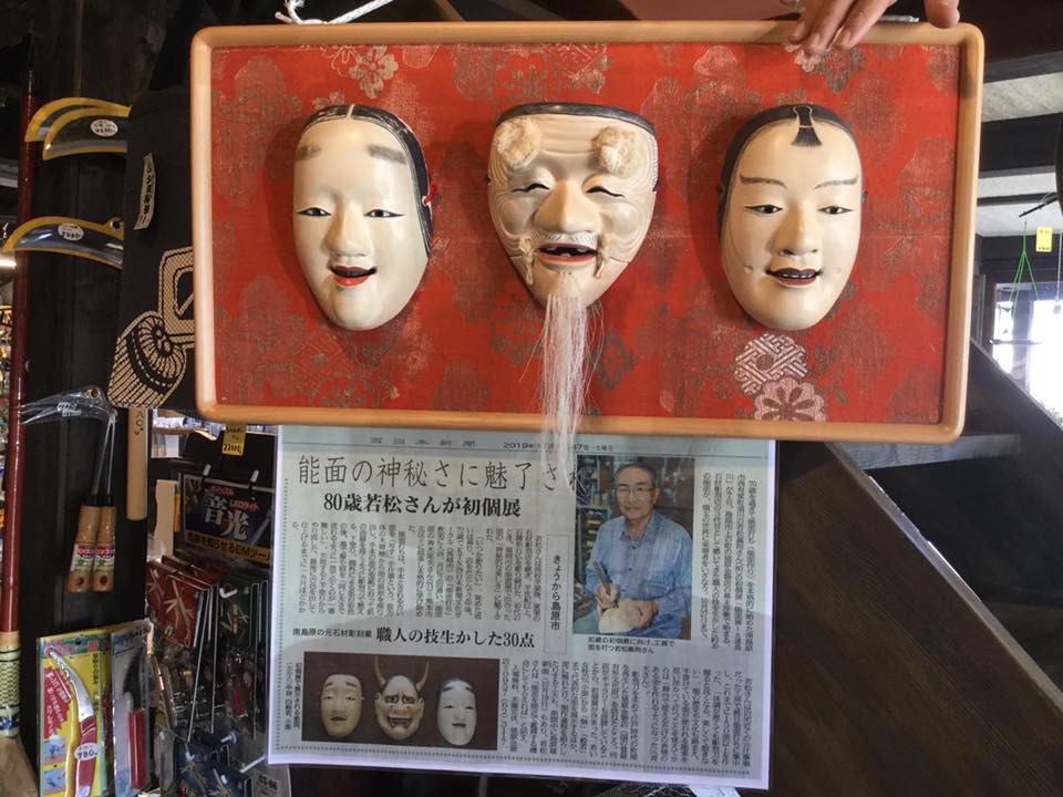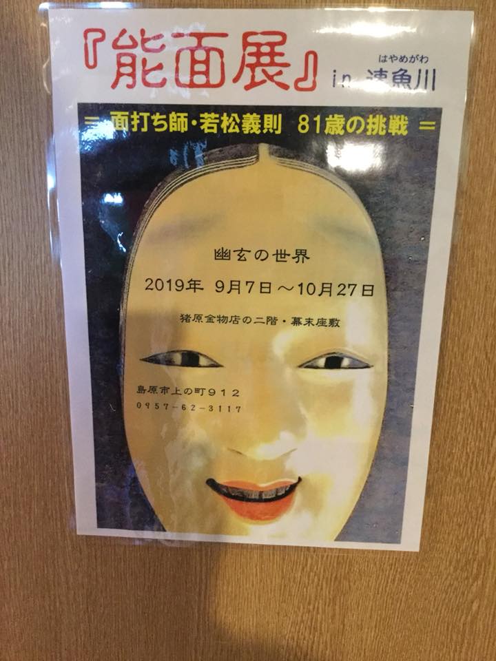 二階の‘幕末座敷’では、「能面展」in速魚川‘面打ち師・若松義則 81歳の挑戦’が9月7日~10月27日まで開催されています。お問い合わせ0957-62-3117(猪原金物店)。