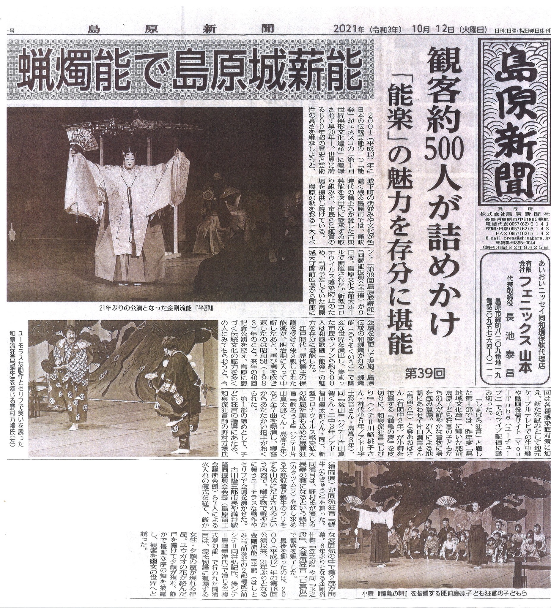 Oct 14, 2021 島原新聞に掲載されました 第39回島原城薪能を地元の歴史ある地域新聞の「島原新聞」で大きくとりあげてくださいました。 島原新聞社様ありがとうございました。 Tweet Posted in お知らせ | No Comments » 関連記事 第43回島原城薪能(会場変更) 九州子ども狂言交流舞台in島原(会場変更) 島原城薪能を味わう 四明荘特別公開講座 いよいよ明日!島原城天守閣前特設能舞台で開催! 島原能楽サロン「島原城薪能を味わう~金剛流能「内外詣」のお話~」 < Youtubeライブ配信 NHK長崎放送のニュースでご紹介いただきました >