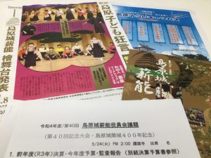 今年度の第40回記念「島原城薪能」の開催に向け、令和4年5月24日(火)14:00~島原城薪能振興会の役員会が開催され、令和3年度の事業報告と決算、今年度の開催に向けての事業計画に向けての審議や予算案が検討されました。