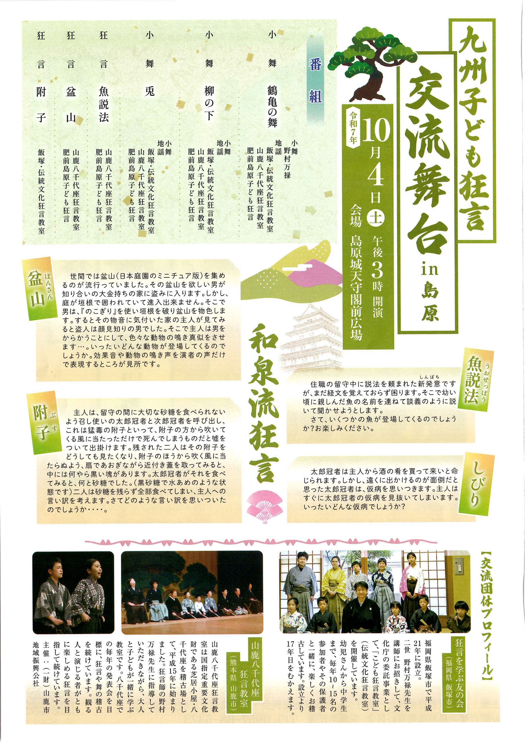 Oct 4, 2025 九州子ども狂言交流舞台in島原(会場変更) 10月4日(土曜日)実施予定の九州子ども狂言交流舞台in島原は、雨の予報により島原文化会館に会場を変更し、実施することになりました。 日時 10月4日(土曜日)15時開演 場所 島原城天守閣前広場 ↓ 変更後 島原文化会館 大ホール Tweet Posted in お知らせ, 子ども狂言 | No Comments » 関連記事 第43回島原城薪能(会場変更) 島原城薪能を味わう 四明荘特別公開講座 いよいよ明日!島原城天守閣前特設能舞台で開催! 島原能楽サロン「島原城薪能を味わう~金剛流能「内外詣」のお話~」 肥前島原子ども狂言の参加募集!島原城築城400年記念「島原城薪能」の舞台に立ってみませんか! < 島原城薪能を味わう 四明荘特別公開講座 第43回島原城薪能(会場変更) >