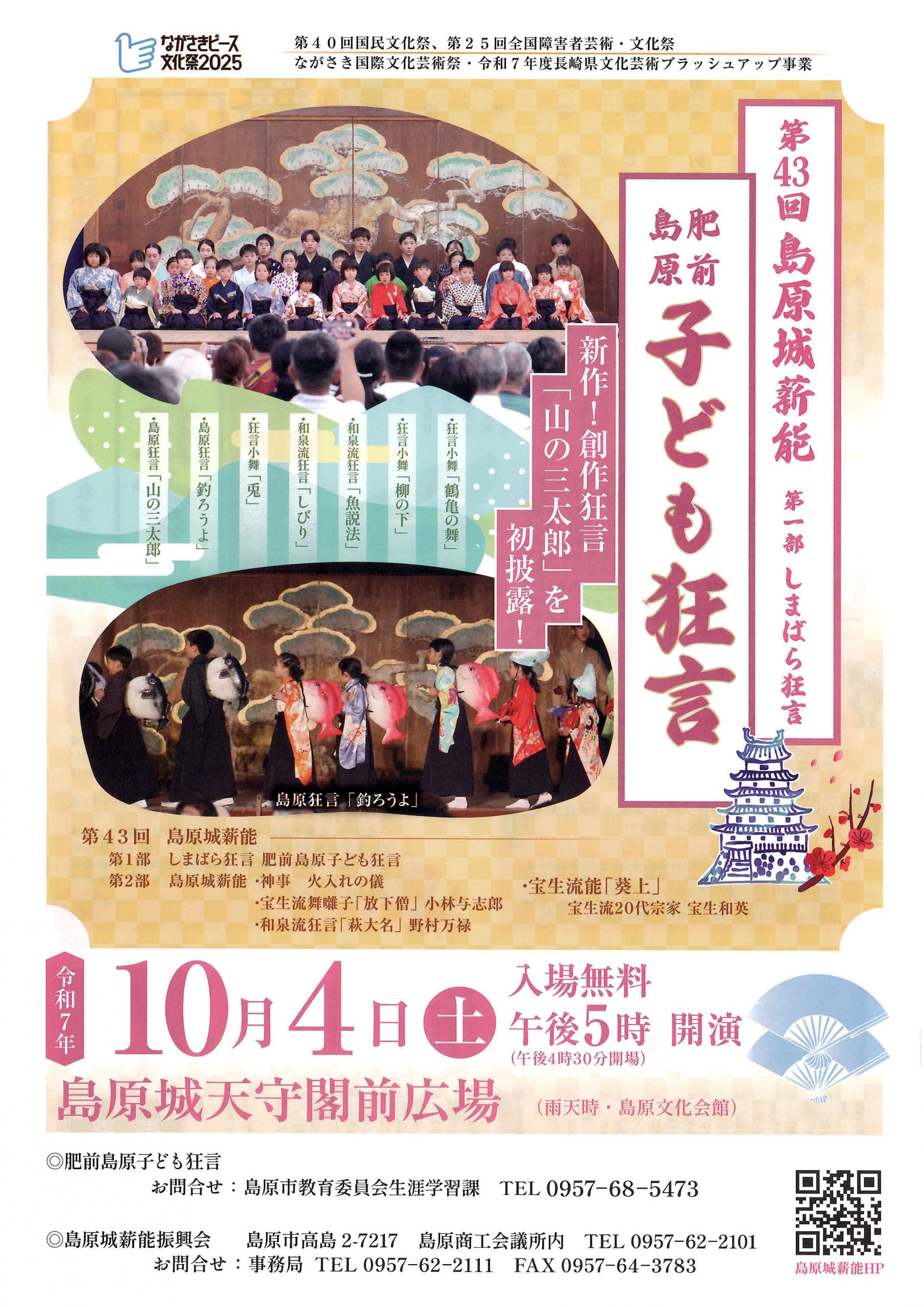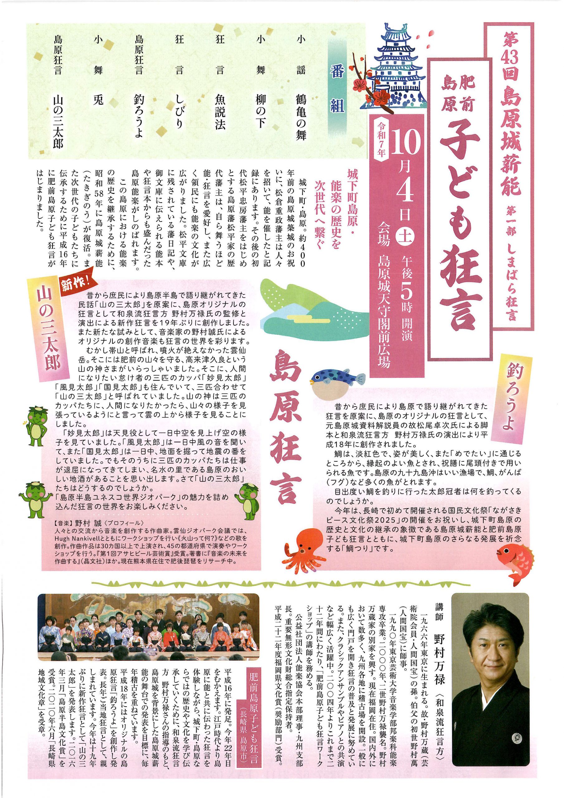 Oct 4, 2025 第43回島原城薪能(会場変更) 本日の『島原城薪能』は、『九州子ども狂言交流舞台in島原』と合わせて、雨の予報により島原文化会館に会場を変更し、実施することになりました。 日時 10月4日(土曜日)17時開演 場所 島原城天守閣前広場 ↓ 変更後 島原文化会館 大ホール Tweet Posted in お知らせ, 子ども狂言, 薪能 | No Comments » 関連記事 九州子ども狂言交流舞台in島原(会場変更) 島原城薪能を味わう 四明荘特別公開講座 いよいよ明日!島原城天守閣前特設能舞台で開催! 島原能楽サロン「島原城薪能を味わう~金剛流能「内外詣」のお話~」 肥前島原子ども狂言の参加募集!島原城築城400年記念「島原城薪能」の舞台に立ってみませんか! < 九州子ども狂言交流舞台in島原(会場変更)